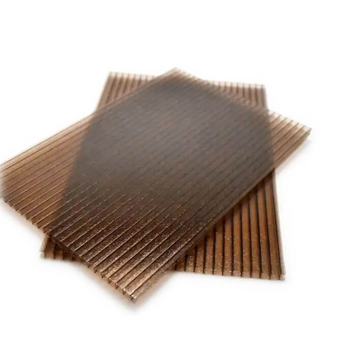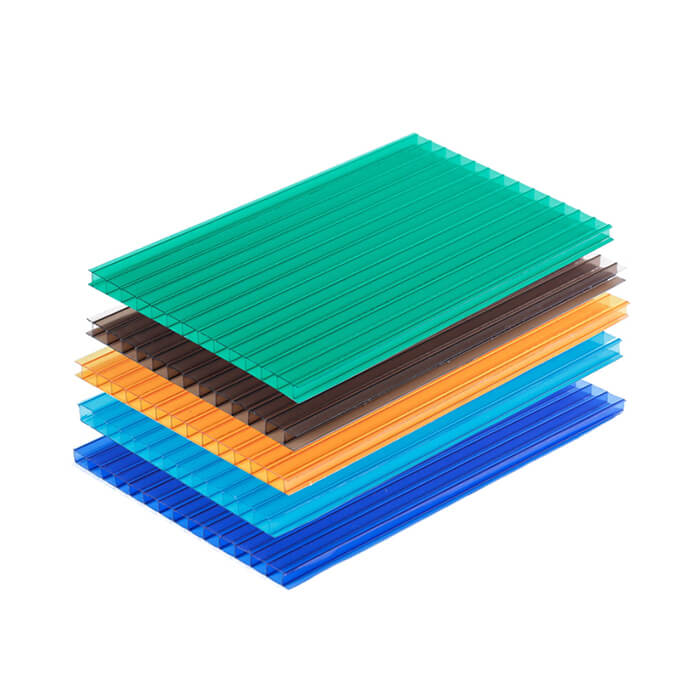 Twin-wall polycarbonate sheet, also known as double wall polycarbonate panel, is light weight and durable roofing sheet. This wall and cavity structure, as well as the inert strength of the polycarbonate it is made from makes it very strong. This means that it can resist impact by up to 200 times more than glass and 8 times than acrylic. Twin-wall Polycarbonate sheets are ideal for applications where specific light transmission is required. Multi-Walls/Twin-wall PC Sheets come in clear, blue, opal, brown, grass green and various tinted colors.